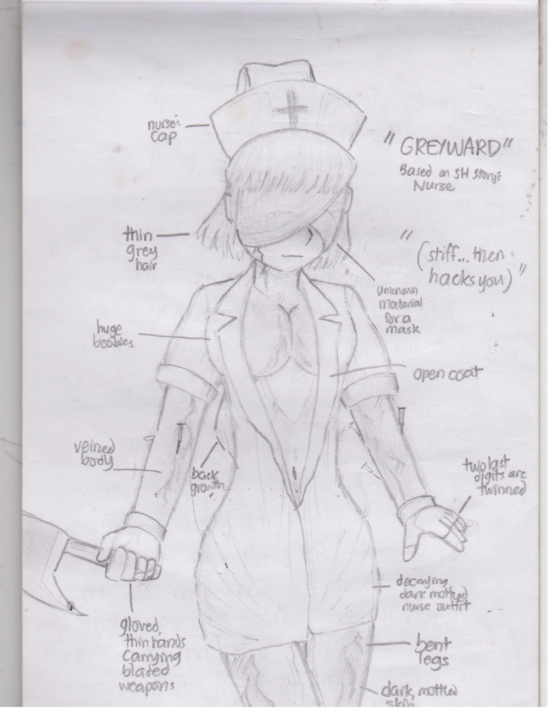 The common Greyward has grey skin, wearing what appears to be a faded, ash-colored medical uniform, complete with a nurse’s cap and heels (some say the heels they wear are already fused with their feet). Their clothing are pressed pretty close to their skin, but is not buttoned shut. The bust and other feminine areas are often exposed and accentuated, making them a lustful sight amidst their solemn air. Other than that, their eyes are often wrapped shut by a texture unknown to man – a sort of second skin. Some believe they are only willing to unwrap this cover when they are facing a person that accepts them wholeheartedly as a woman.