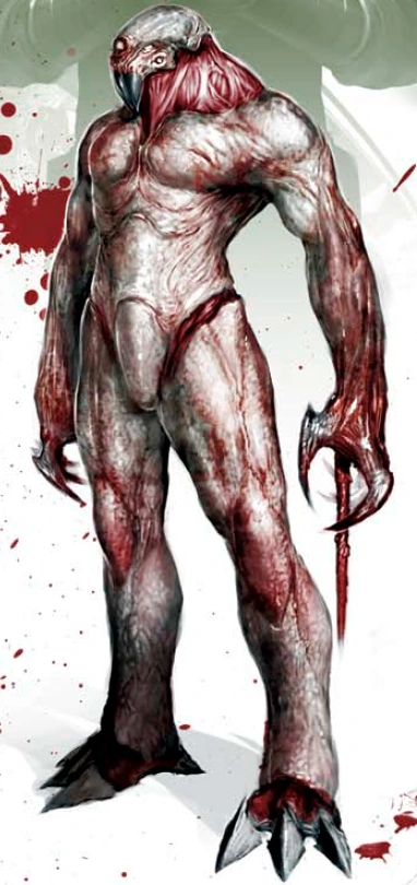 forms the external combat armor, which acts like a protective armor but also like a second skin, with all acompanying tactile and pain senses. He gains a significant boost in height, going from his original 1.55 meters to 2.25 meters, easily dwarfing the average basketball player. The armor seems composed of a white bone/keratin like material, covering most of the body save for the areas around limb joints and the neck, instead a thick leathery tissue cover said areas for better flexibility. The hands and feet are „outfitted” with razor-sharp claws capable of tearing even through metals. The transformation can be swift for quick action. A notable characteristic is possesion of a beak-like structure to facilitate breathing in harsh environments and to somewhat distort his voice with an odd reverb, two sets of eyes on the cranial area, as well as a fith „eye” with an unkown application (Lance was not yet able to figure what it does, he assumes it posseses some kind of special sense). While Lance can access all his abilities in the symbiote form at their fullest (relatively), he can also benefit from the biological impowerment in his human form although not as greatly (symbiote form can surpass even other outwordly creatures, human form is somewhat below human peak)